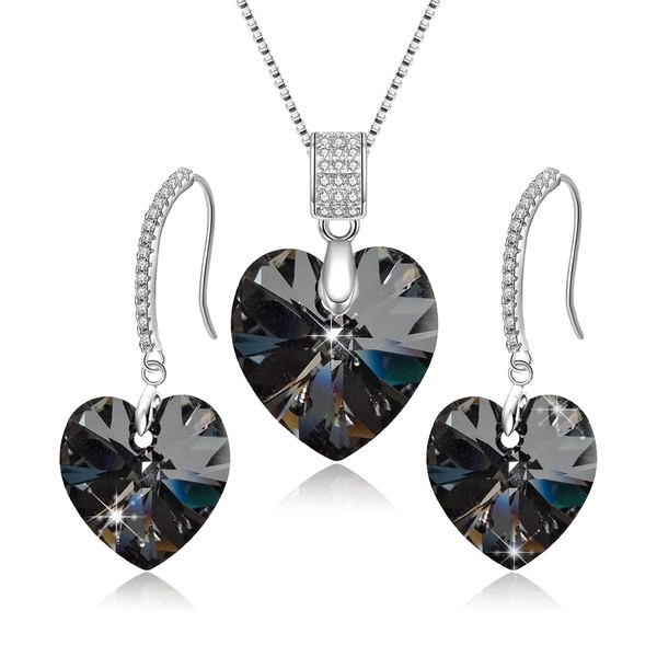 Love Heart Necklace Earrings Jewelry Set for Women Austrian Crystal Dangle Earrings Christmas Jewelry Gift for Women Wife (Black)