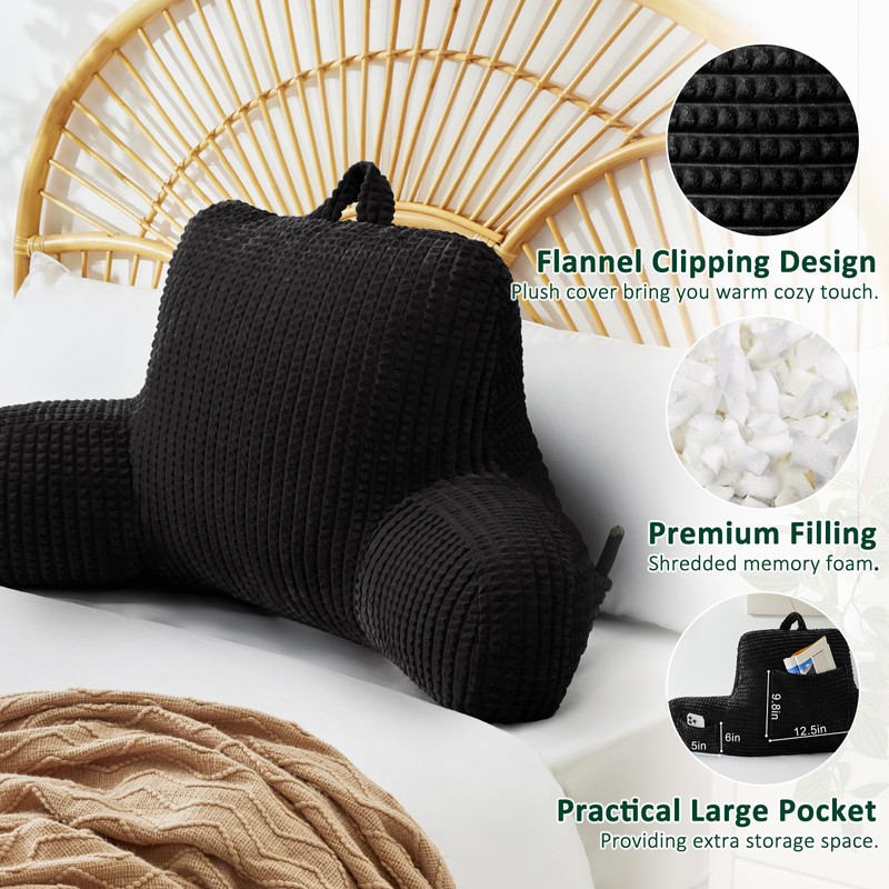Love's cabin Reading Pillow for Bed, Memory Foam Back Pillow for Bed Sitting Up, Bed Rest Pillow with Arms and Pockets for Adults, Back Support Pillow for Bed, Couch and Chair, Black