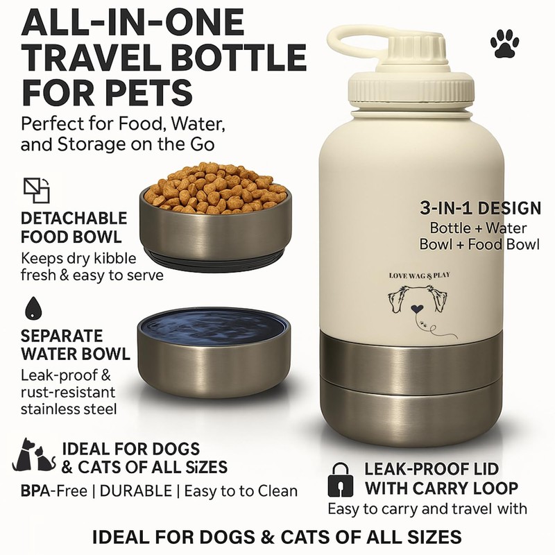 - 🦴 2-in-1 Bottle & Bowl Design – Features a built-in water bowl and food bowl base so your pet can eat or drink naturally anywhere — no extra dishes needed!