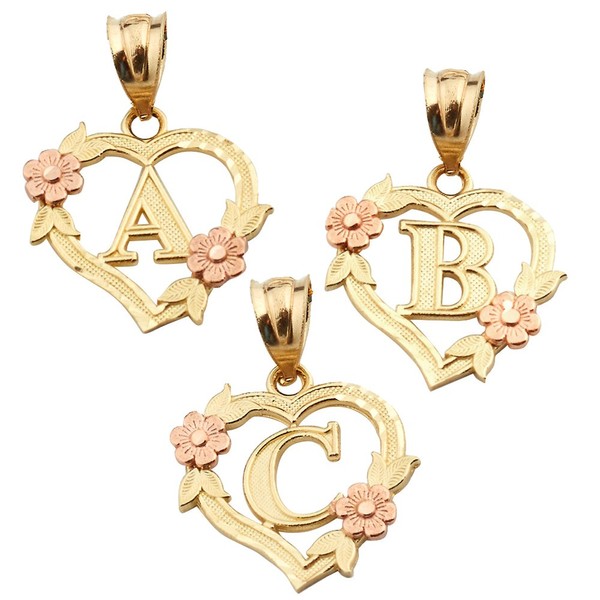 LoveBling 10K Yellow Gold Alphabet Initial Charm Necklace Pendant with Beautiful Heart and Rose Border (L)