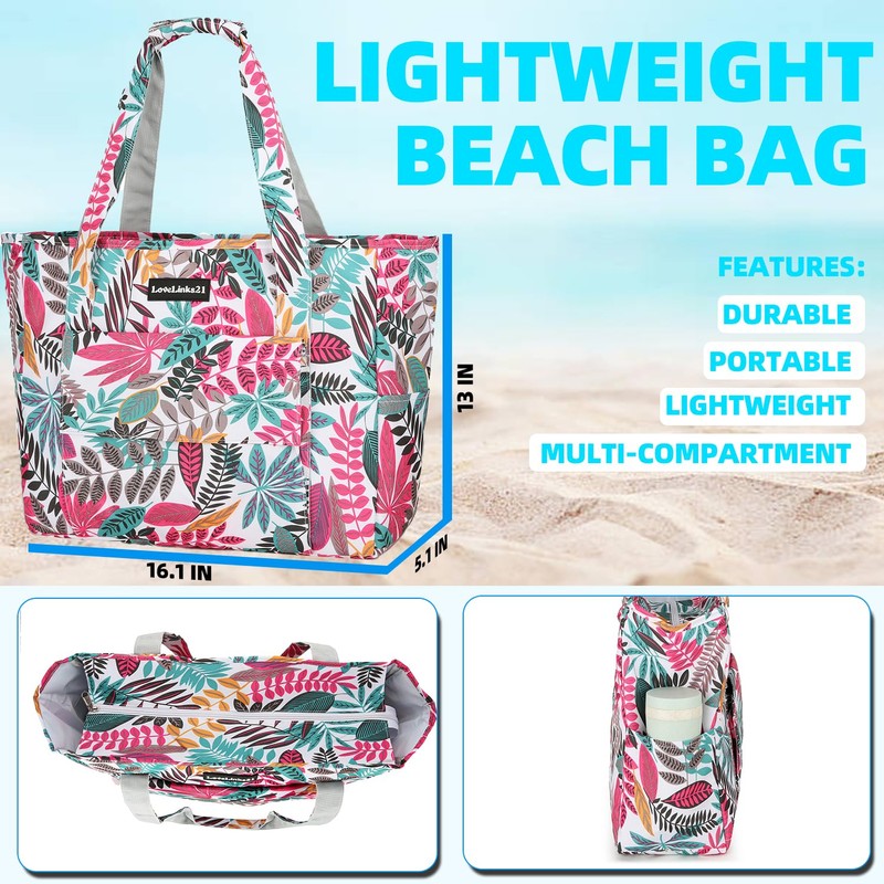 Lovelinks21 Beach Bag Waterproof Sand Resistant Women's Tote Pool Bag with Zipper for Gym Groceries Travel with Wet Pockets (red leave)