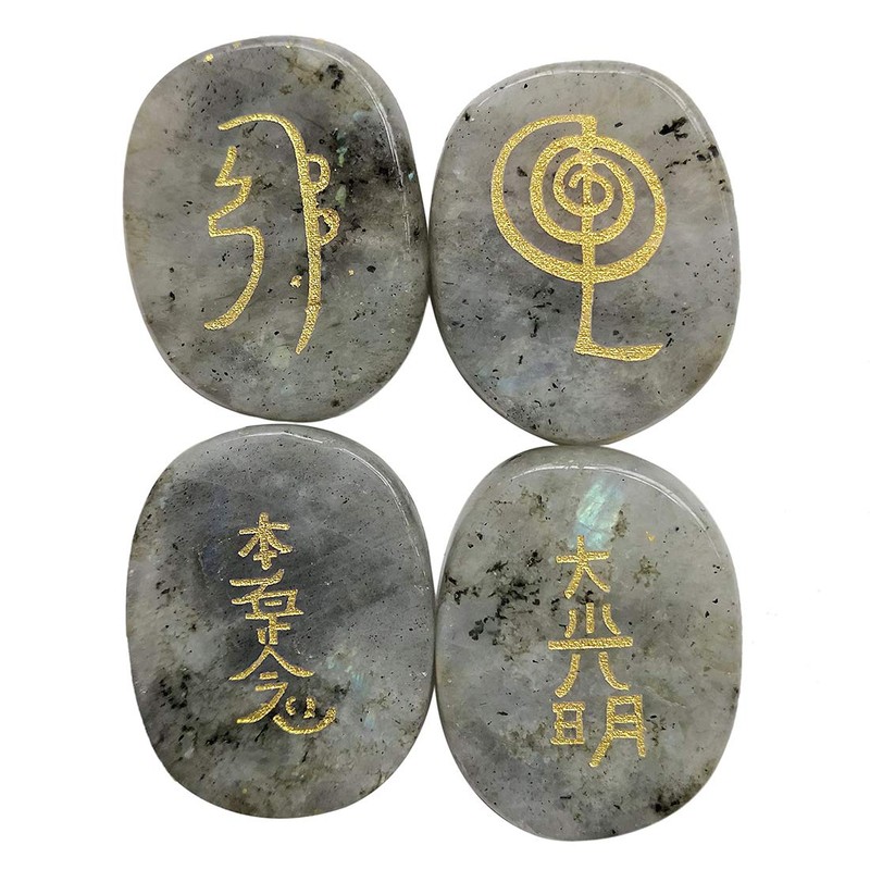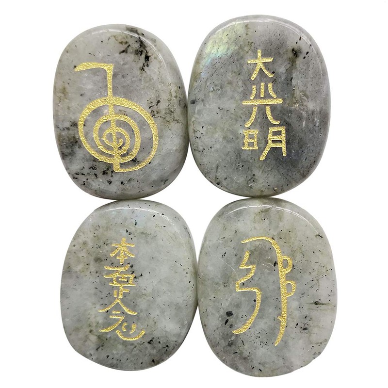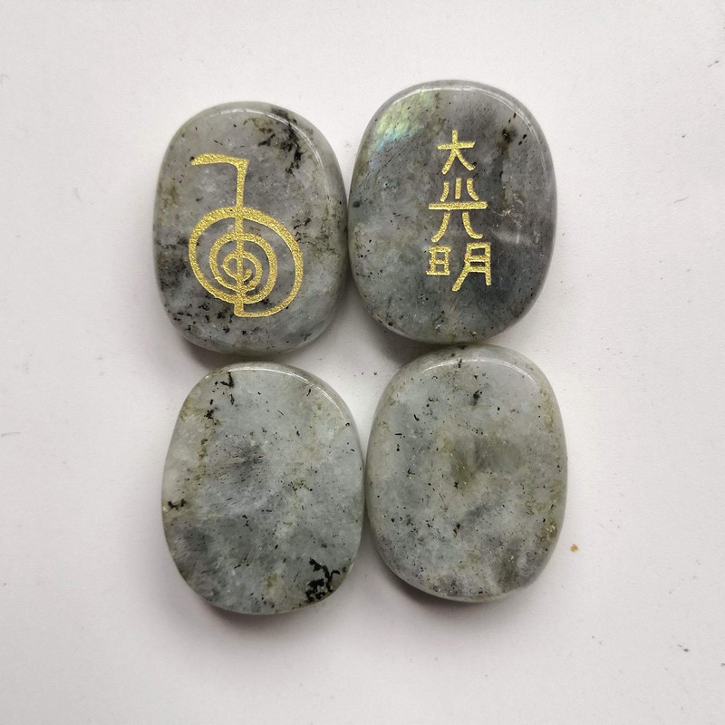 • Set of 4 Stones are etched with the following traditional Usui Reiki symbols:Cho Ku Ray (Power),Sei Hei Ki(Purification & Harmony), Hon Sha Ze Sho Nen(Connection),& Dai Ko Myo (Empowerment & Enlightenment)