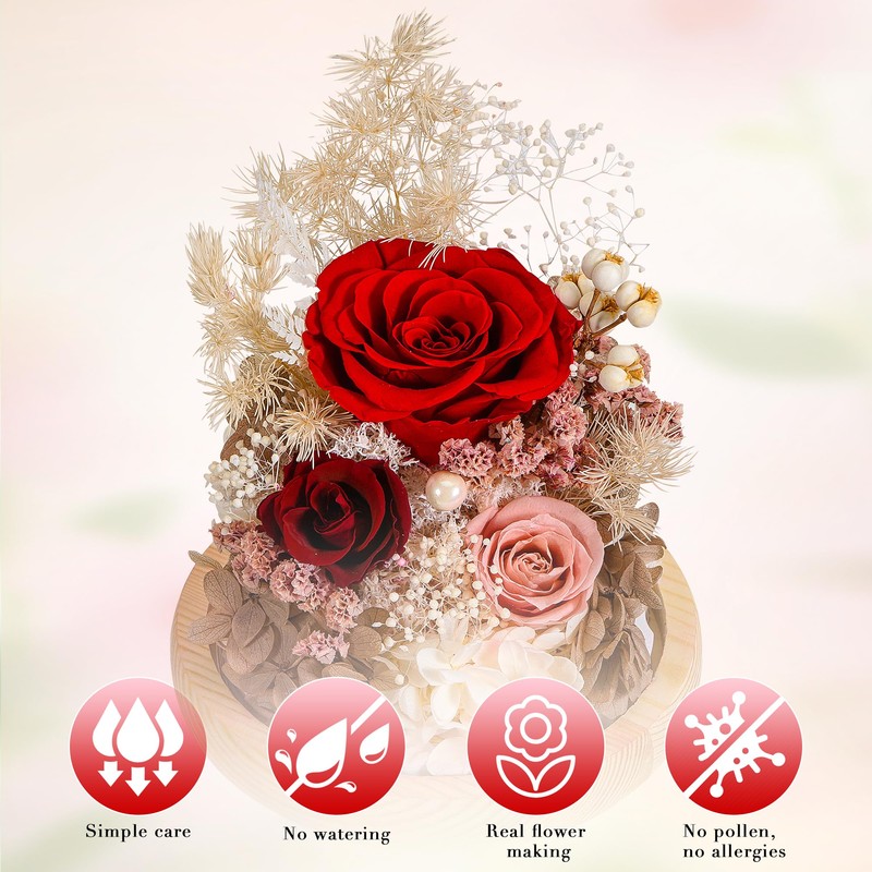 - Easy to Care - Natural flowers are delicate, it is not recommended to open the glass cover, it will cause accidental damage to the flowers. Do not water, do not sunlight.