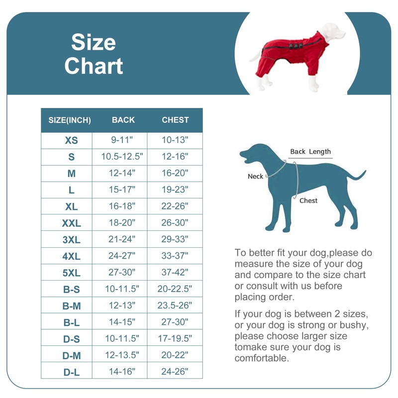 - SIZE CHART - Comes with 15 sizes for you to choose from. XS/ S/ M/ L/ XL for small dogs; XXL/ 3XL/ 4XL/ 5XL for large dogs; B-S/ B-M/ B-L for pug, bulldog (strong but short dogs); D-S/ D-M/ D-L for dachshund, corgi (short legs but long body dogs).