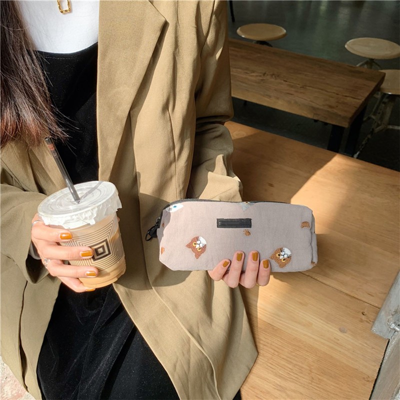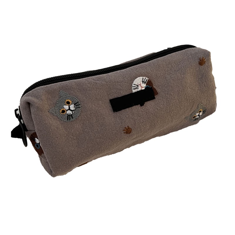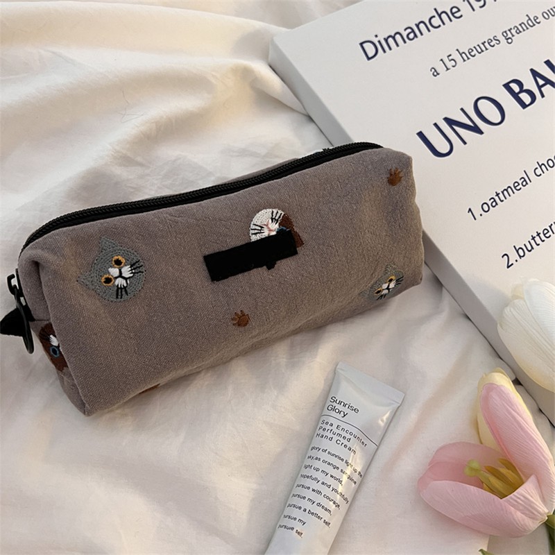 Lovely Embroidery Pattern Pencil Case Cotton Cloth Pen Bag Multipurpose Large Capacity Pencil Case for Girls Students Grey