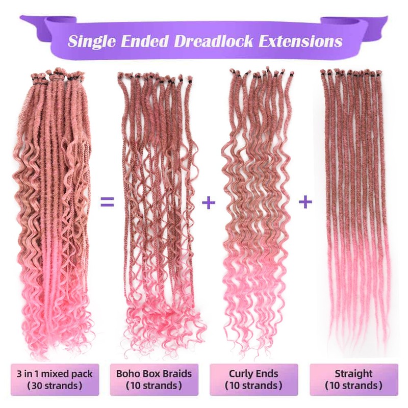 Lovenea 24 Inch 3 In 1 Synthetic Hair Dreadlock Extensions 30 Strands SE Dreads Extensions Handmade Soft Single Ended Straight Curly Boho Wavy Dreads (30/Pink#, 30S)