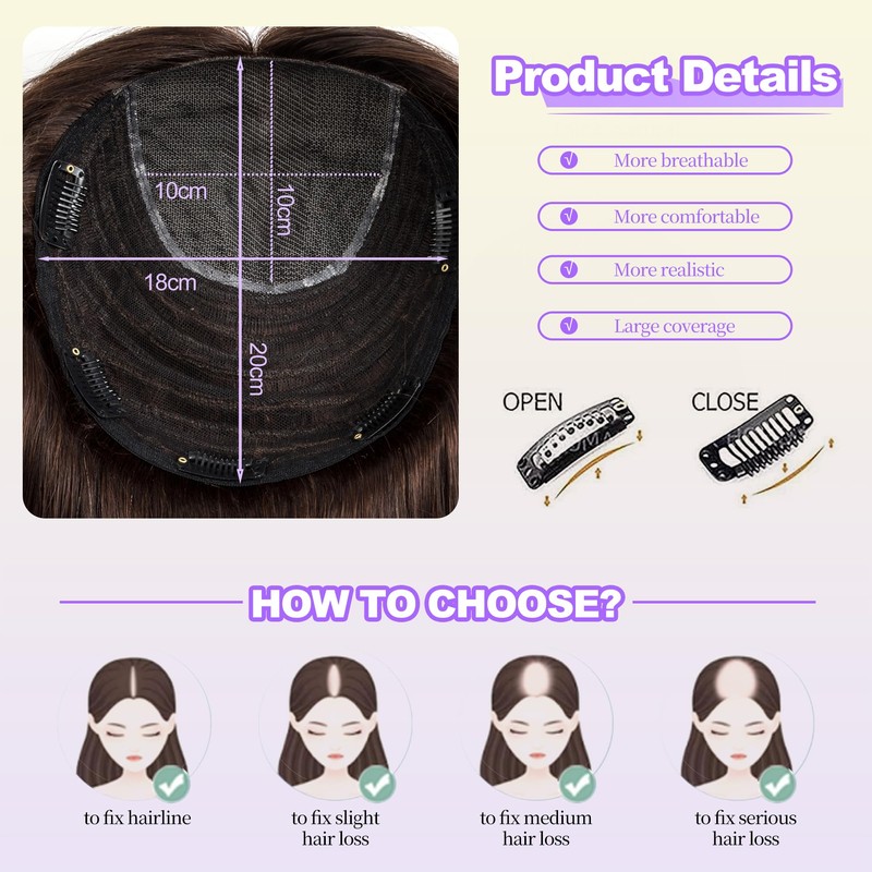 - ❤Easy Maintenance❤: 100% Real Human Hair Toppers Hair Pieces that You Can Comb, Trim, Perm or Dye Just Like Your Own Hair. Frequent Styling May Cause Dry End or Split, Use Mild Conditioner Can Prolong the Usage of Topper Hair Extensions.