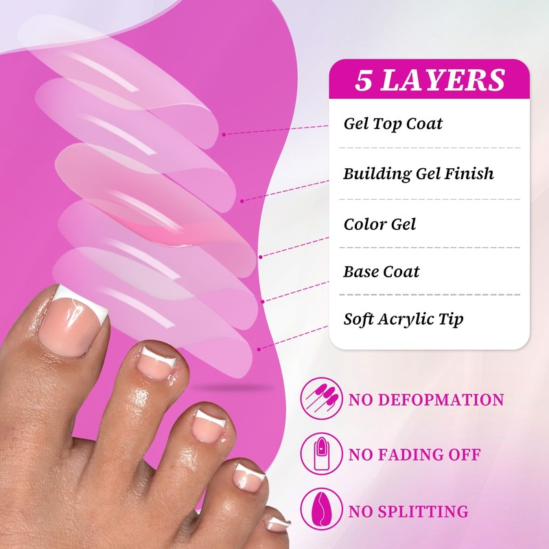 • Easy Applications French Press-on Nails Toe Tips: Toenails french tips press ons fake toe nails allows you get salon-perfect toenails instantly. Just trim and file your toe nails, clean your natural toes, apply nail adhesive tabs on fake toenails, then press on and hold few seconds, a chic and stylish french pedicure toe nail is done!