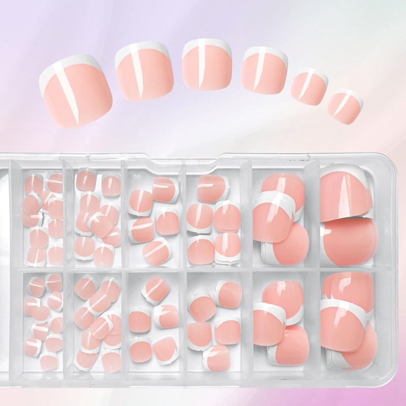 • White French Tips Press on Toenails for Women: Toenails press on nails french tips contain 120pc white french tips jelly nude fake toenails short square shape, 5 sheet nail adhesive tabs, 1pc mini nail file, and 1pc wooden stick. French tips toe fake nails with glue are excellent for a quickly at home nail art manicure, don't need addtionaly nail supplies like nail decorations or nail polish. DIY nails in minutes without go to nail salon.