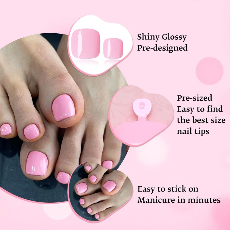 - đź’…Quick and Easy Solution for Pedicure: Toe glue on nails with adhesive glue protect natural nails from staining and damage caused by frequent polishing, curing or removals, Moreover, Pink toe fake nails can also solve nail problems such as nails that are too short, too slanted, ungle nails, brittle nails and weak nails. Pink toe acrylic nails allow your natural toenails to rest and strengthen between applications.