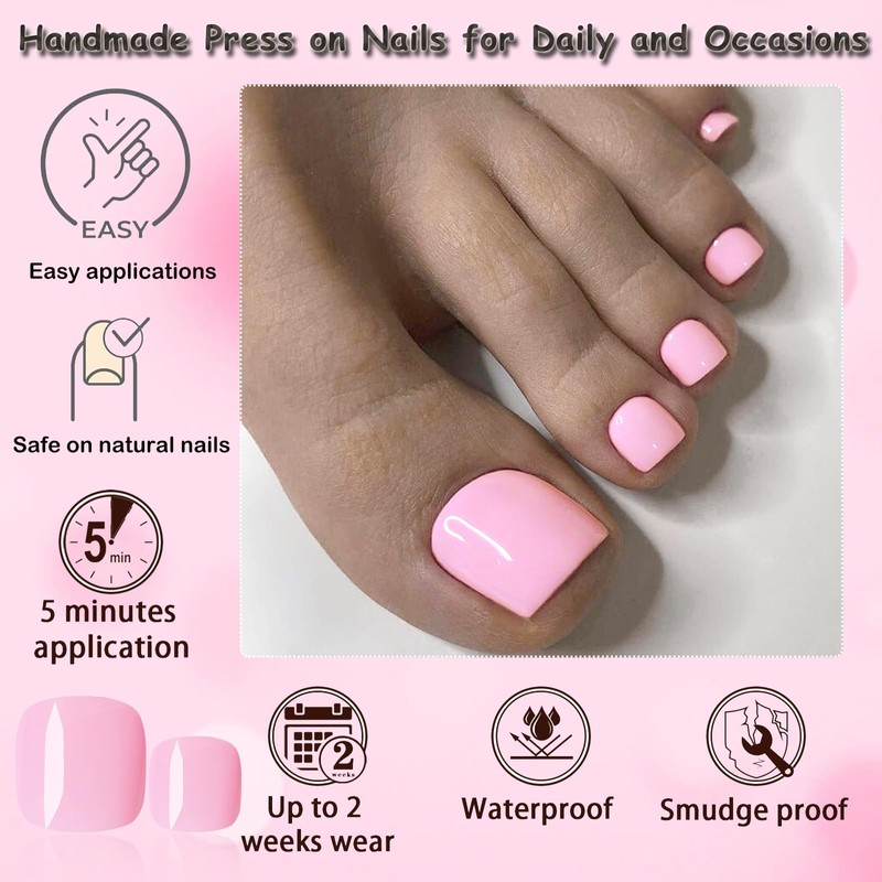 - đź’…Short Square Fake Nails for Toes: Pink press on toenails for women feature a clean, minimal shape with a tapered square tips. Pink toe fake nails provides a tailored look for people preferring pop and elegant toenails that interfere with your normal life and travel and you are free to do whatever you want. False toenails with glue look natural and trendy on feet and won't affect daily life and sport. You can wear press on pink toenails to hike, wakling, dancing, swimming ect.