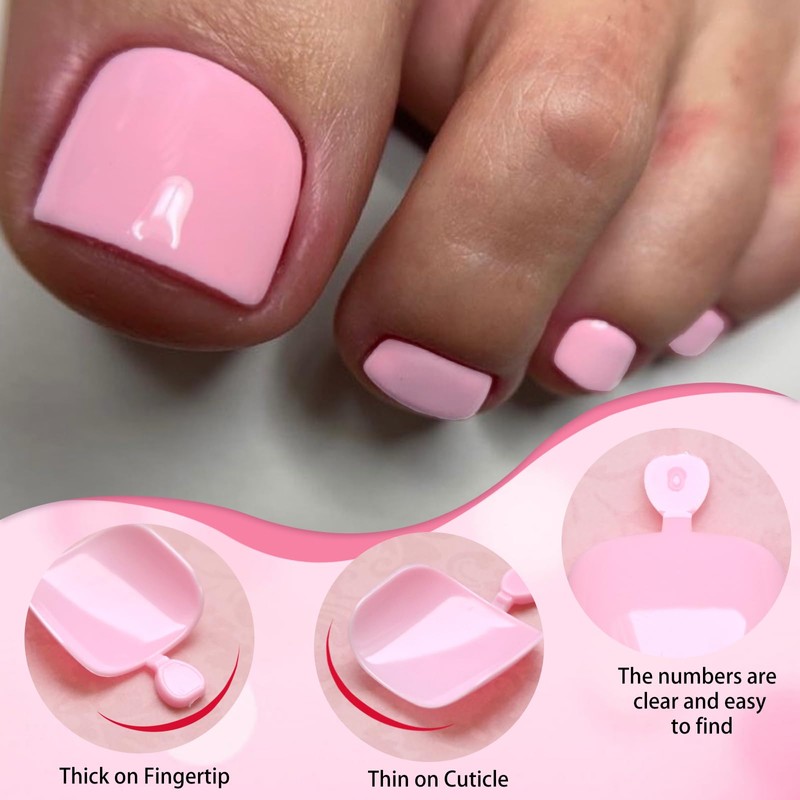 - đź’…Quanlity Toe Glue on Toenails: Pink fake toenails press ons are made of quality ABS formulated to have a natural nail-like appearance. Pre-shaped toenails press on nails have a thin, flexible back edge for a seamless fit and comfortable wear, thick front tips for a strong and lasting wear.Pink toenails fake feet provide full coverage square tips in a short square cut for a clean, filed-down effect. You can DIY salon perfect Pink pedicure at home in few minutes with Pink artificial toe nails.