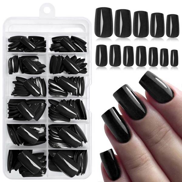 - Square Press on Nails Kit: Black square fake nail kit come with 12 grids 240pc black press on nails medium length square nails with 1 tube nail glue, 5 sheets adhesive tabs, 1pc nail sticks and 1pc nail file for quick at home manicure. Medium length press on nails black fingernails are packed with reusable case that easy for you to reach out and choose suitable size square nail tips. Medium press on nails with glue tabs are ideal for glue on nails medium length for nail salon and nail beginner or lover nail extension design.
