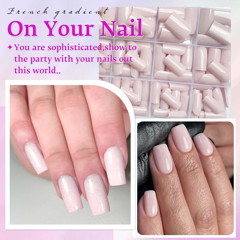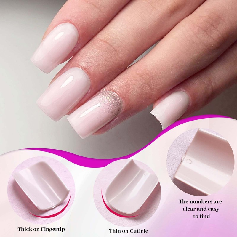 - Customized Square Glue on Nails for Most Fingers: Light pink press on nails medium length square artificial nails come in upgraded 14 sizes to fit most nail beds for a comfortable, seamless fit. Double-sided adhesive tabs allow you to choose the best size nail tips that suits each nail and without damage to natural nail bed. 14 sizes square nails glue on fingernails can fit for wide/petite/cure/small nail beds hands. A fake nails set for both women and teen girls.