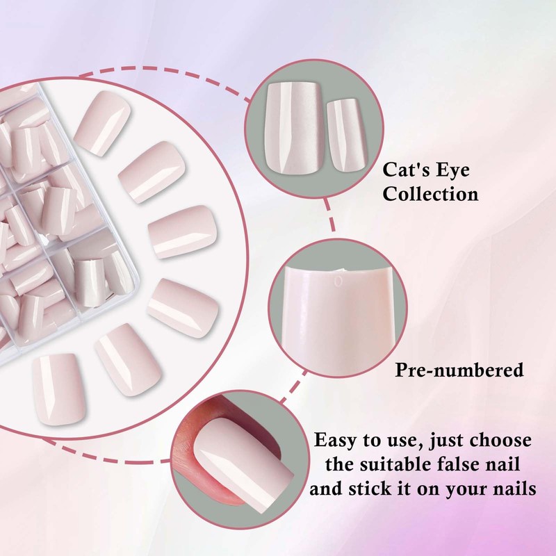 - Medium Square Press on Nails Kit: Square fake nail kit includes 288pc point pink press on nails medium length square nail tips, 28pc cat eye press on nails and adhesive nail tabs, nail file plus nail stick. Press on nails set with tools are friendly to nail beginner or nail techs have a quick at home manicure. Press on nails with adhesive tabs are perfec for travel, home, salon and on the go nail design.