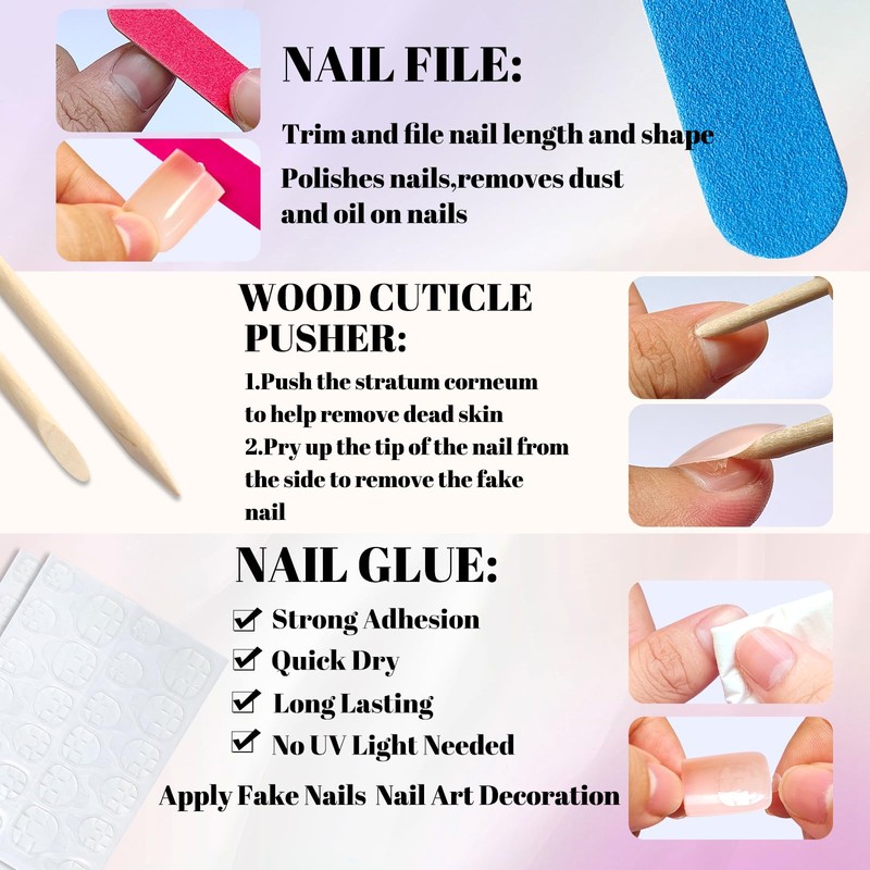 - Convenience Fake Nails with Tabs: medium square press on nails white pink provide a quick and easy solution for manicure at home. Square nails with sticker means no drying time is required, medium nails press ons nail square can be applied and removed instantly without damage. Sticky nail sticker make press ons nail reusable, say goodbye to frequent nail salon visit. Medium square nail tips allows you change your nail style anytime and anywhere.