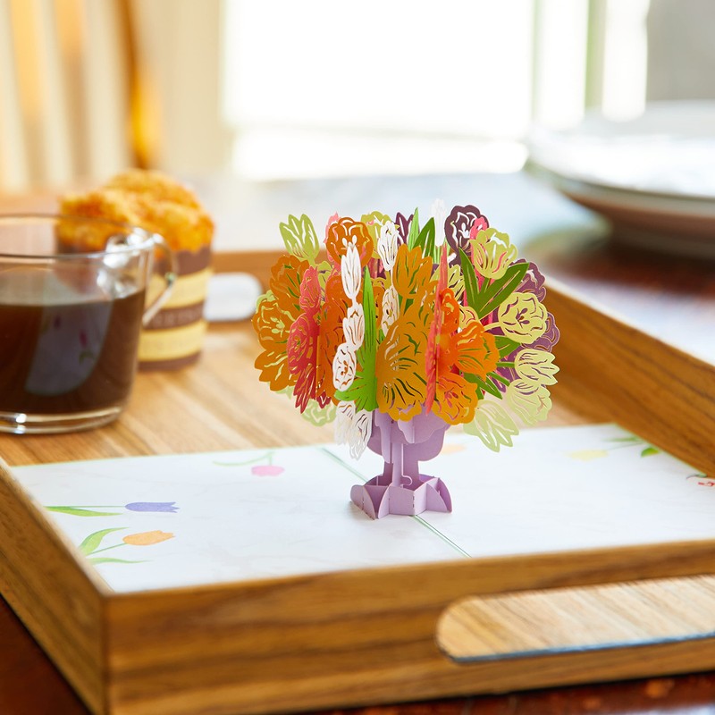 - Unique 3D pop-up card "Tulip Bouquet" - An elegant floral greeting for special occasions - This artfully designed pop-up greeting card unfolds a magnificent 3D bouquet of multi-coloured tulips rising from an elegant light purple vase.