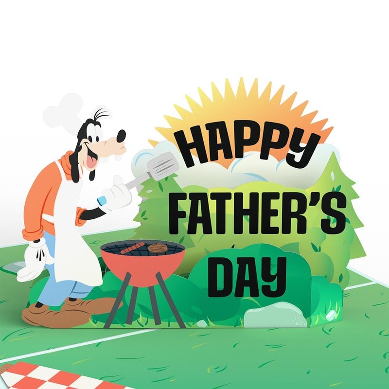 - PERFECT POP UP FATHERS DAY CARD: Celebrate the dads in your life with a Disney’s Goofy-inspired Father's Day pop-up card. The cover of this greeting card says, 'To the goofiest dad around...' and the inside message says, 'Happy father's day'.