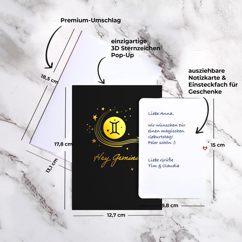 • VIBRANT 3D DESIGN OF TWINS - The zodiac sign Gemini pop-up card features two stylized figures representing the duality and charm of the zodiac sign Gemini. Surrounded by sparkling stars and delicate details, the card captures the vivid and creative energy of the twins in an impressive way.