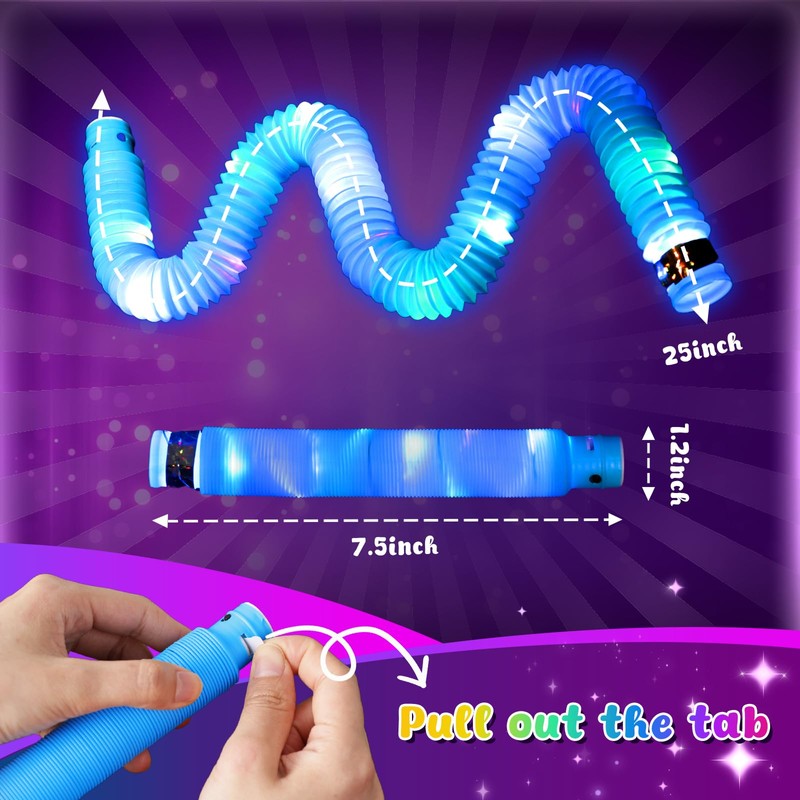 - Large Number of Glow Sticks - Retractable Design: Perfect for kids' events, festivals, and parties, this set includes 24 glow sticks in 6 vibrant colors. Each pop tube features 14 bright LED bulbs with 3 lighting modes: fast flash, slow flash, and steady light, creating a captivating glow. When stretched, each tube extends to 25 inches, while its size is 7.5 x 1.2 inches before stretching