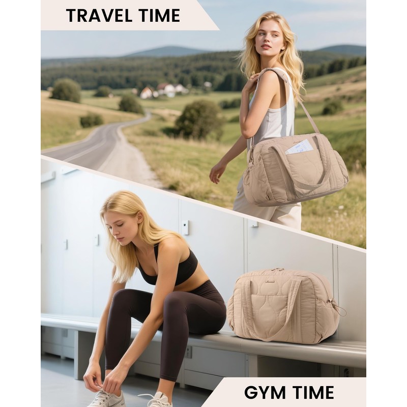 LOVEVOOK Gym Bag for Women, Puffer Travel Duffle Bag with Wet Pocket, Lightweight Carry On Bag Weekender Overnight Bag with Toiletry Bag, Multiple Pockets Hospital Bags for Labor and Delivery, Khaki