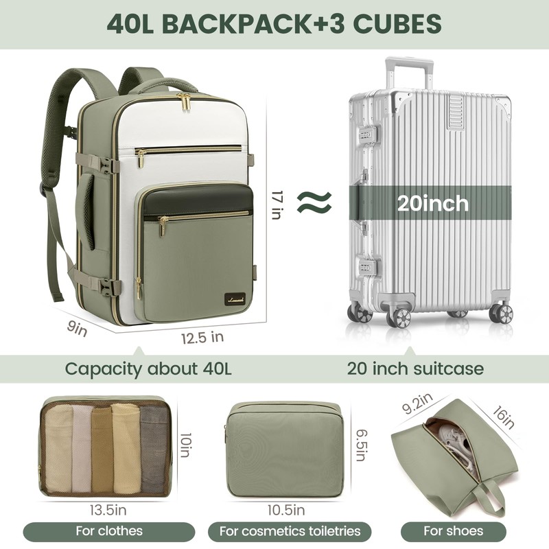 LOVEVOOK Travel Backpack For Women,40L Carry On Backpack Flight Approved,TSA Personal Item Travel Bag Fits 17 Inch Laptop,Weekender Overnight Daypack with Toiletry Bag and Cube,White Light-brown