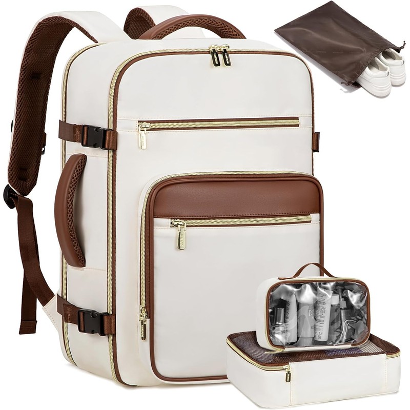 LOVEVOOK Travel Backpack For Women,40L Carry On Backpack Flight Approved,TSA Personal Item Travel Bag Fits 17 Inch Laptop,Weekender Overnight Daypack with Toiletry Bag and Cube,White Light-brown