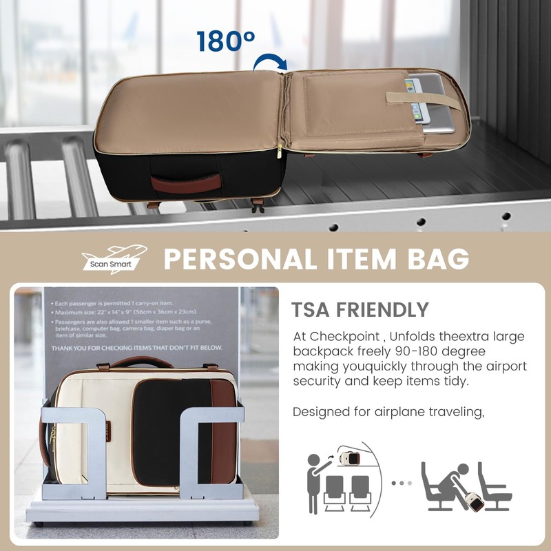 - 【Airline Approved & Convenient】:Measuring 18.5X9 X19 inches, this carry-on backpack for airplanes fits under seats and in overhead compartments, making it the perfect travel backpack personal item size for air transportation. The TSA-friendly design with a 180-degree opening gives you easy access to your belongings just like a suitcase. The convenient luggage strap attaches to your suitcase handle for hands-free navigation.