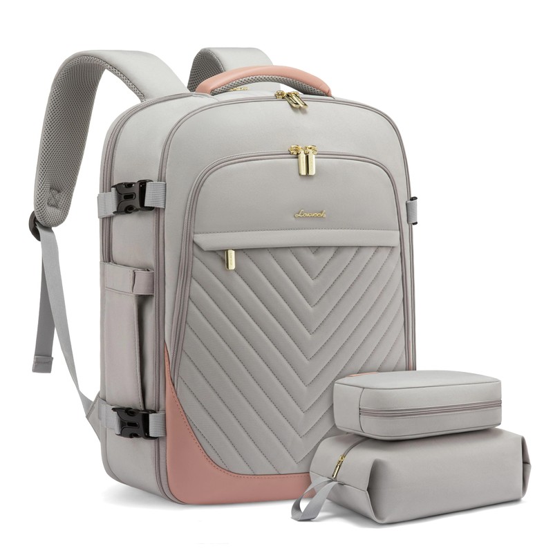 LOVEVOOK Travel Backpack for Women, TSA Approved Carry On Backpack with 2 Packing Cubes, Personal Item Backpack Fits 17 Inch Laptop, Weekender Water-resistant Daypack, Grey-Pink