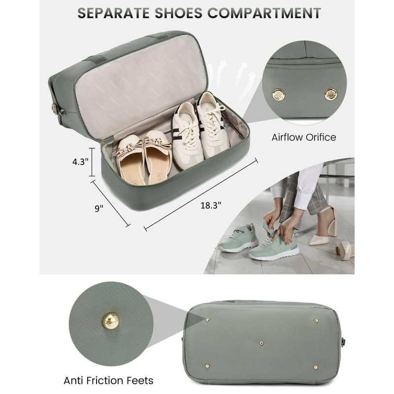 - đăSpacious &Durable Travel Tote Bag with Shoe CompartmentăThe travel bags for women with toiletry bag to keep your cosmetics/toiletries organized on-the-go. Lightweight duffle bag women offers ample storage without weighing you down.With the separate shoe compartment to keep your shoes or laundry separate from clean items.Ideal for new moms, this tote doubles as a diaper bag and even a hospital or medical bag. Don't miss out on this versatile travel essential