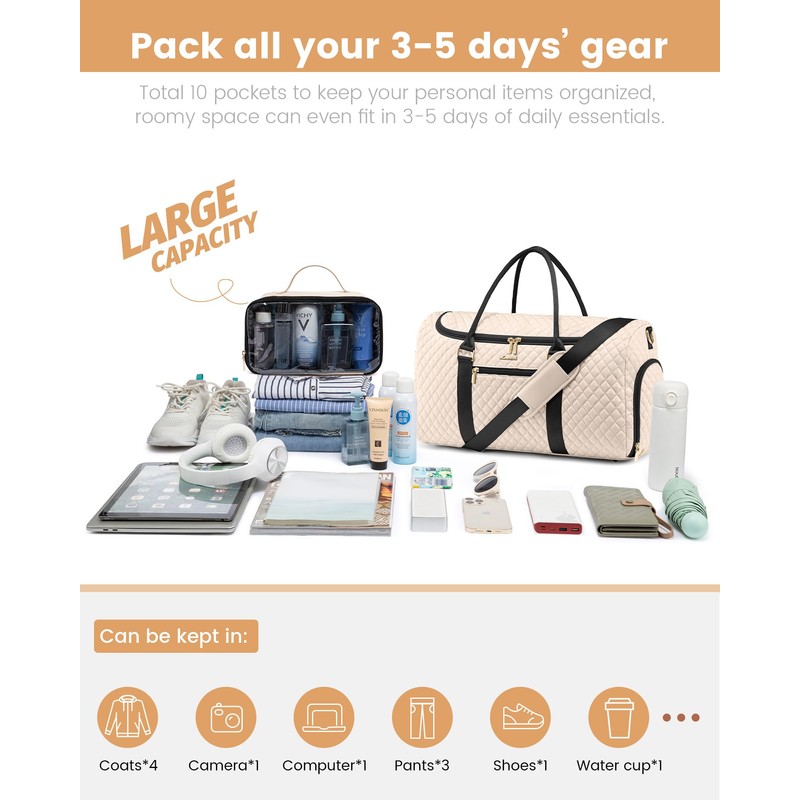 - 【LARGE CAPACITY】: This weekend bag for women has 1 main compartment and 9 Multifunctional pockets, to fit 3-5 days' daily essentials. The spacious compartment can hold your clothes, laptops, documents, toiletries, electronic devices, and other items you need.