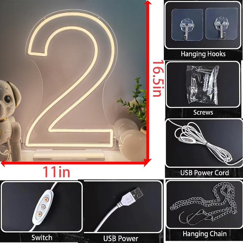 - đăSleek Dimensions and Warm White Radianceă: Elevate your dĂ©cor with this impressive Number Neon Sign, boasting generous dimensions of 16.5 x 11 inches. Emitting a chic warm white glow, it exudes a contemporary and refined ambiance that enriches any setting.