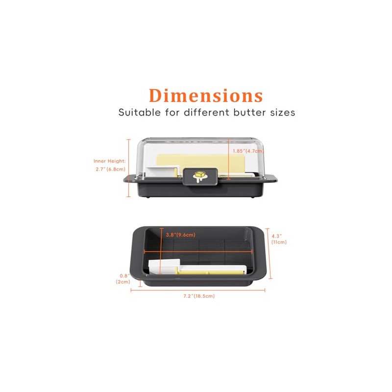 - Dairy Spread Dish DISH WITH LID AND KNIFE : 18.5 * 11 * 6.8cm, 500g butter capacity is just about 200g of butter commonly found on the market, easy to organize and store, special design spoon layout and the inner part of the grid line with a graduated dosage can be controlled to use easily and conveniently can reduce waste