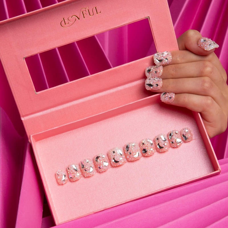 LOVFUL Press on Nails BERRY SHAKE PINK| Handmade with Full Covered Crystals | Reusable Fake Nails | Square Short 0.8 in | H56-M