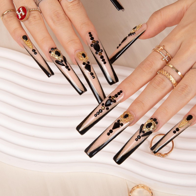 LOVFUL Press on Nails Obsidian Palace Black French Tip | Handmade with Full Covered Crystals | Reusable Full Cover Nails | Square Long 2.2 in | H165-M