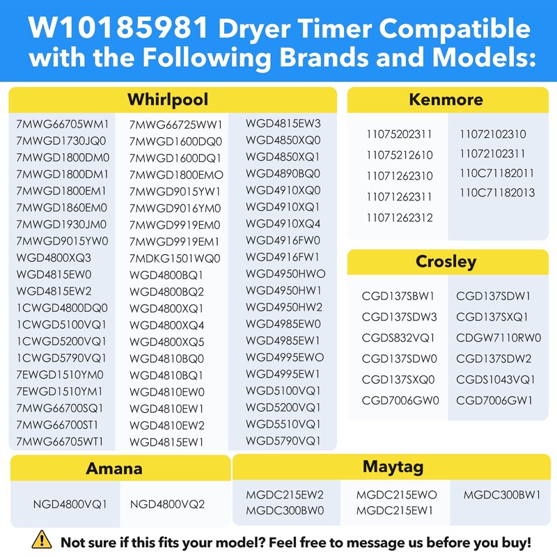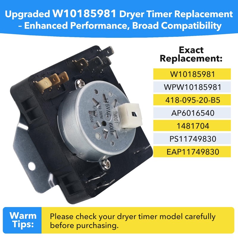 - Seamless Fit for Major Dryer Brands: Genuine OEM Dryer Timer replacement for W10185981 and equivalent to WPW10185981, 418-095-20-B5, AP6016540, PS11749830, EAP11749830, and 1481704. Built to fit select models from Whirlpool, Maytag, Kenmore, Crosley, Amana, and more—ensuring easy replacement without guesswork