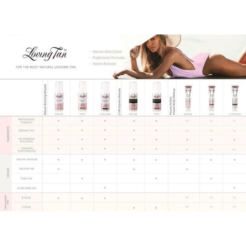 Made by tan lovers for tan lovers, Loving Tan 2HR Express Mousse gives you a natural looking, sexy tan within minutes. The salon inspired formula provides you with an immediate colour, while developing into a deeper, darker tan which can be washed off after 2 hours! The colour guide technology ensures an easy, streak free application every time. It is both quick drying and deliciously fragrant. This product is best suited to Light to Medium skin tones