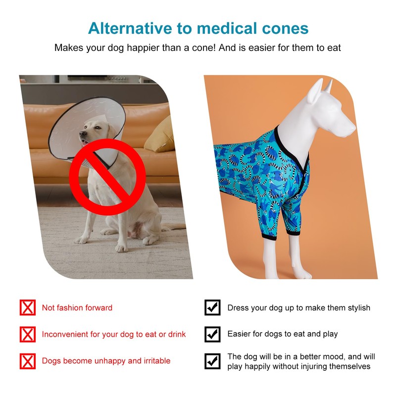 - A Buyer's Story: Our large dog has a skin rash is was constantly licking it. Since she has poor eyesight the "cone of shame" was not an option. Fits our big dog well with a little room for movement. We do roll up the sleeves as she has short legs. And she looks so cute in this big dog jammies