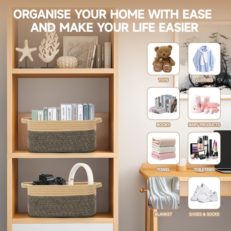 - 【Decorative Basket】Our square cotton rope storage baskets are full of fashion. The woven design of these storage baskets can add a touch of rustic charm to any room decoration, making them a perfect addition to your living room, bedroom, bathroom or nursery. These square storage baskets can enhance the style of your home decoration. They are both beautiful and practical. They are very suitable for storing children's toys or storing items at home.