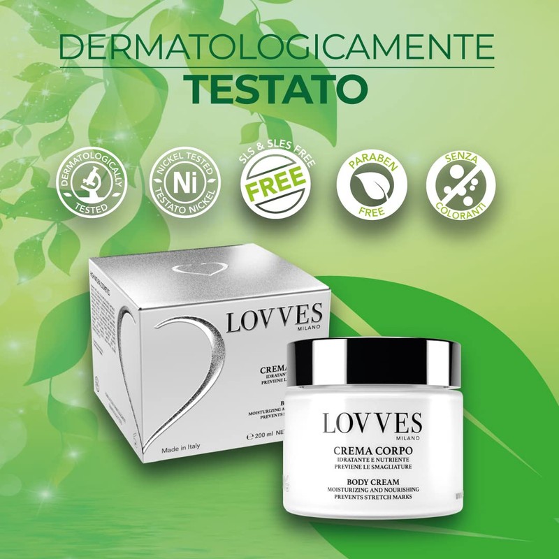 - Certified and safe product "Made in Italy": body cream on a natural basis. Dermatologically tested and nickel tested, not tested on animals. 100% developed and produced in Italy. Product 100% free from: parabens, SLS & SLES, PEG, silicones, paraffins, alcohol, dyes; contains natural perfume. Organic ingredients.