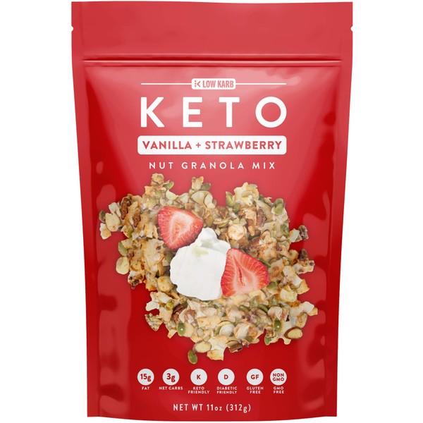 Low Karb - Keto Vanilla Strawberry Nut Granola Healthy Breakfast Cereal - Low Carb Snacks & Food - 3g Net Carbs - Gluten Free, Grain Free - Almonds, Pecans, Coconut and more (11 oz) (1 Count)