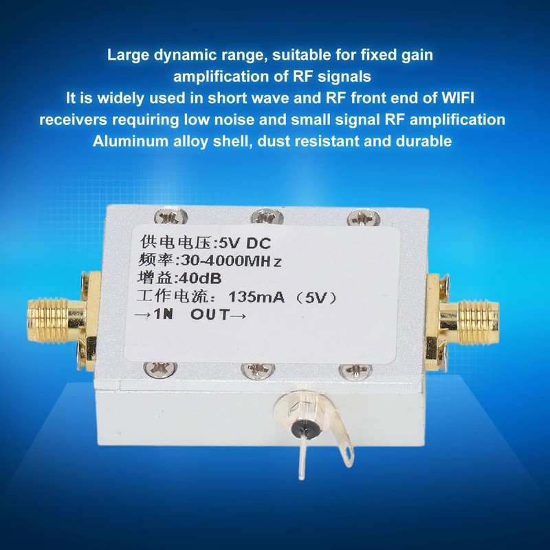 - The amplifier is a 30-4000 MHz amplifier with wide dynamic range and is suitable for amplifying RF signals with fixed gain. It can receive front-end circuits to extend the communication distance.