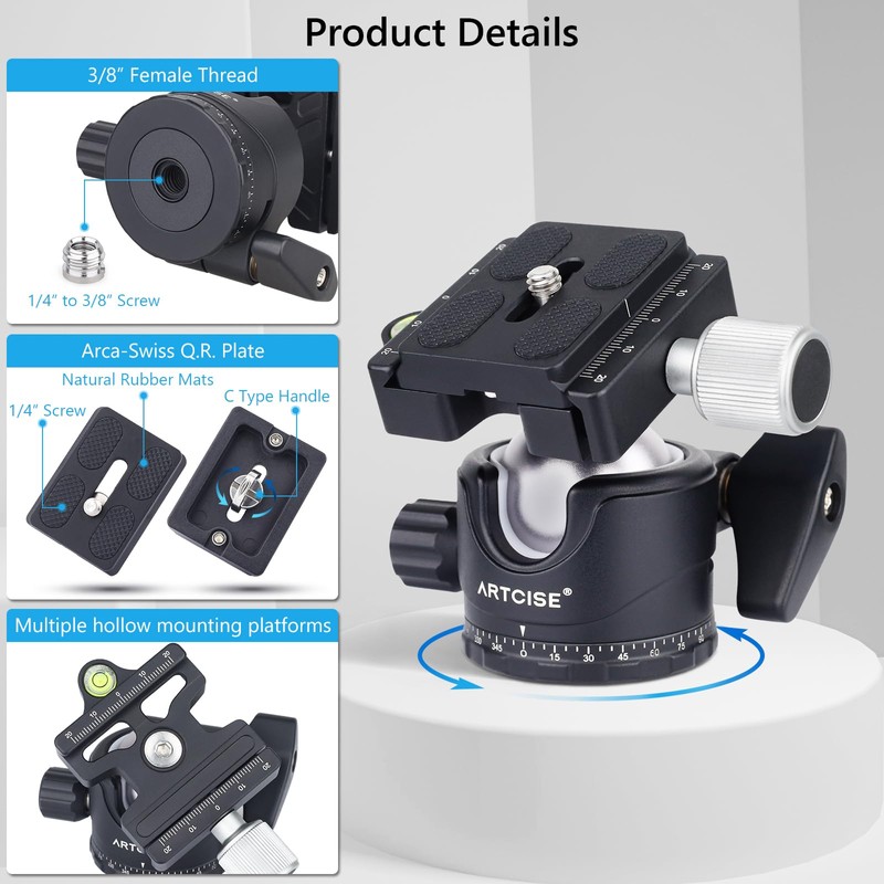- 【HIGH QUALITY ALL-METAL TRTIPOD BALL HEAD】: High-quality all-metal ball head, Aluminum-Alloy Material, the sphere’s diameter is 36mm, CNC super machining, multi Anodized Surface treatment with the lighter weight, the smoother hand feel, more stronger loading capacity and more excellent durability. Knob anti-lost design lets you no longer have a risk of losing the knob.