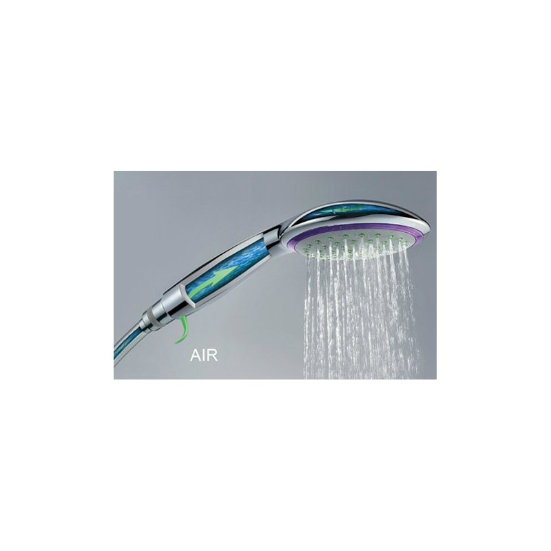 A water saving aerating device is fitted at the base of the shower. Air will be inhaled continuously into water stream through the venturi hole to create a mix of water and air, this speeds up the water stream leading to an improvement of the water pressure, meanwhile water would be saved as air takes up half of the space. When water reaches the skin, it explodes automatically giving a pressurized and oxygenised SPA and massage feeling, with an enhanced blood circulation effect