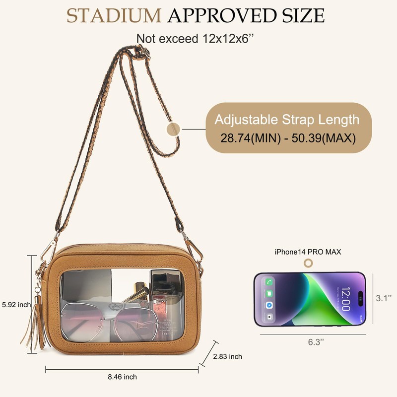 - 👉【Perfect Size】Measuring 8.46L x 2.83W x 5.92H inches. 1 main compartment is big enough, you can put your cell phone, wallet, keys, cards and cosmetics inside, to meet the needs of your daily life. This clear bag for stadium events has a zipper closure, ensuring the security of items.