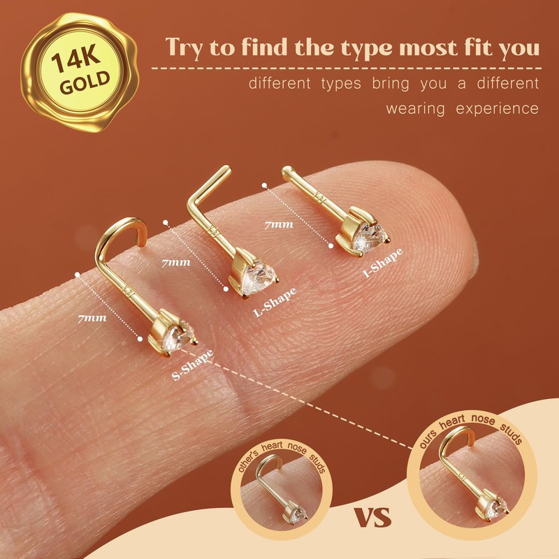 - STABILITY HEART NOSE STUDS: Every piece of our jewellery passes rigorous inspection, specially customized, the nose stud is lightweight and small, easy to wear and carry. Exqusitely handcrafted with high polish smooth surface. L/S shape design, I shape nose stud with small ball at the tail, reducing the risk of falling, is easier to put on and off.