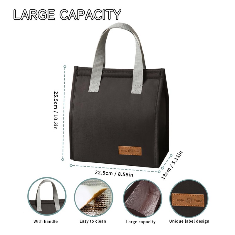 - Large Capacity: Designed with ample space, this portable lunch bag can comfortably hold a variety of food items, making it ideal for meals on the go. Its large capacity accommodates containers, drinks, and snacks effortlessly