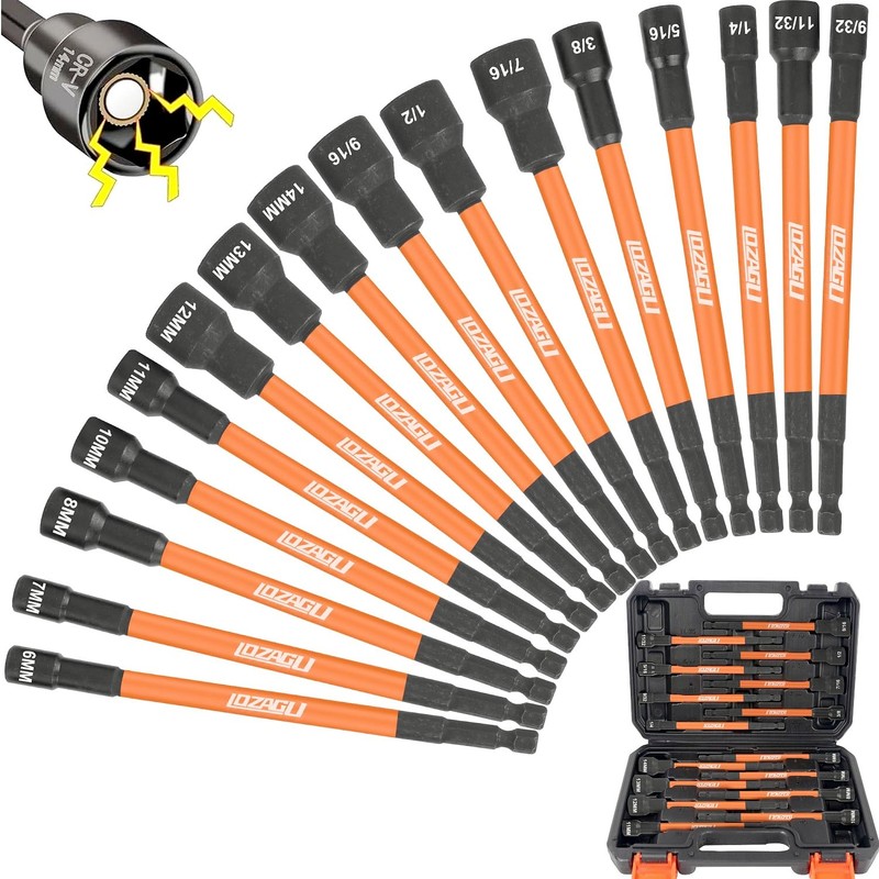 LOZAGU 16PCS Magnetic Nut Driver Set | 6 Inch Long Nut Driver Set | SAE and Metric | 1/4 Inch Hex Shank | Cr-V Steel