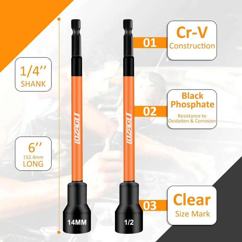 - Premium Materials: Our impact nut driver setter is made of industrial grade chromium vanadium steel, which is strong and durable, and has a black phosphate coating for corrosion resistance.
