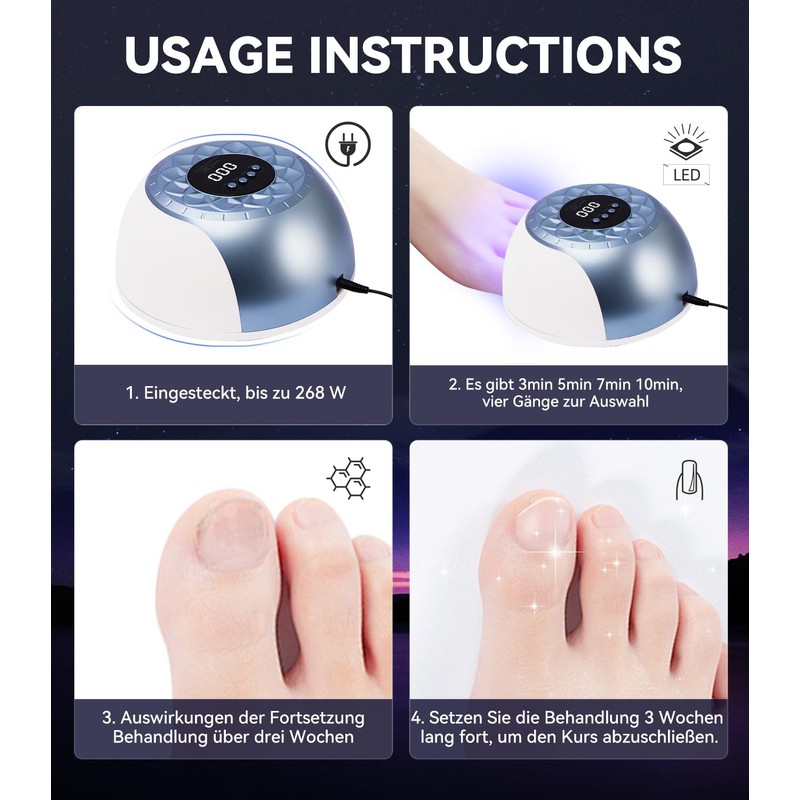 - 💗Anwendungshinweise: Vor Einsatz Nägel säubern und kürzen. Gerät anschließen, Zeitdauer wählen → Automatische Beendigung nach Ablauf. Nutzungsintervall: Jeden zweiten Tag (ca. 3 Tage/Woche). Tägliche Einsatzdauer: Leichte Fälle 3-5 Minuten, fortgeschrittene Fälle 5-7 Minuten. Zur unterstützenden Pflege mit antimykotischen Pflegeprodukten kombinieren.